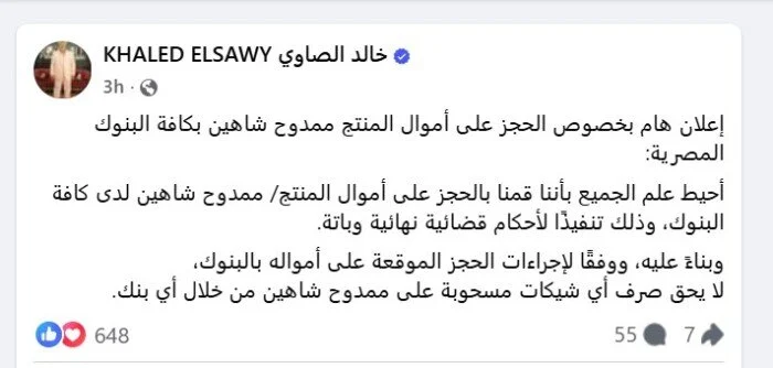 وكتب خالد الصاوى عبر حسابه الرسمى على «فيسبوك»: “إعلان هام بخصوص الحجز على أموال المنتج ممدوح شاهين بكافة البنوك المصرية.. أحيط علم الجميع بأننا قمنا بالحجز على أموال المنتج ممدوح شاهين لدى كافة البنوك، وذلك تنفيذًا لأحكام قضائية نهائية وباتة وبناءً عليه، ووفقًا لإجراءات الحجز الموقعة على أمواله بالبنوك، لا يحق صرف أى شيكات مسحوبة على ممدوح شاهين من خلال أى بنك”.