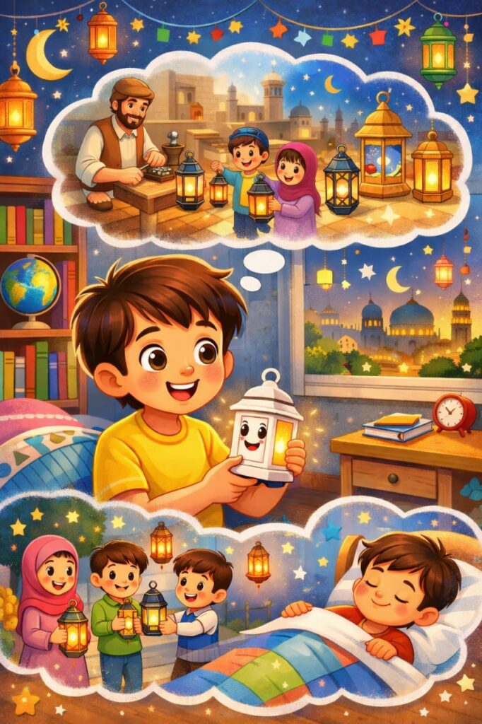 وفجأة، استيقظ كريم على صوت أمه تنادي عليه لكي يذهب إلى المدرسة، وقال: كان حلمًا جميلًا، لكني تعلمت الكثير والكثير، وسأشتري فوانيس صغيرة مضيئة، وسأوزعها على الأطفال المحتاجين لكي يشعروا بفرحة رمضان.